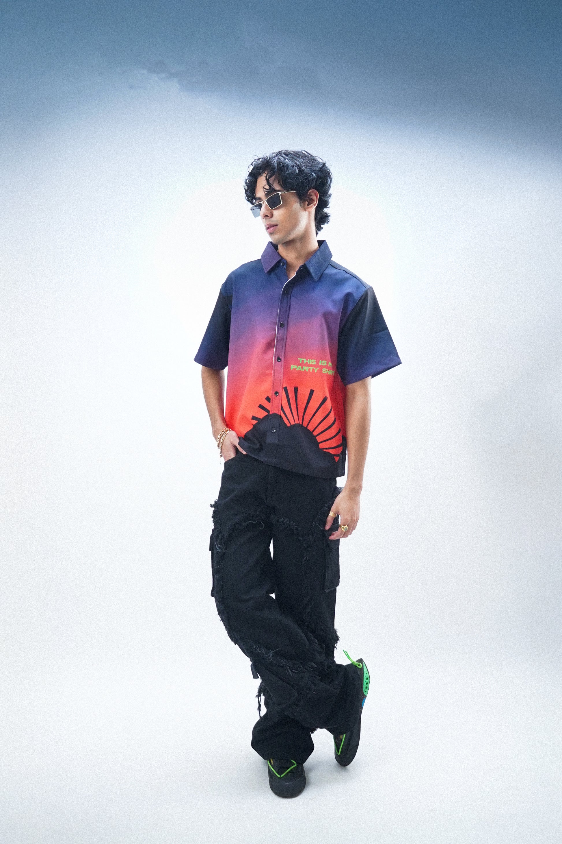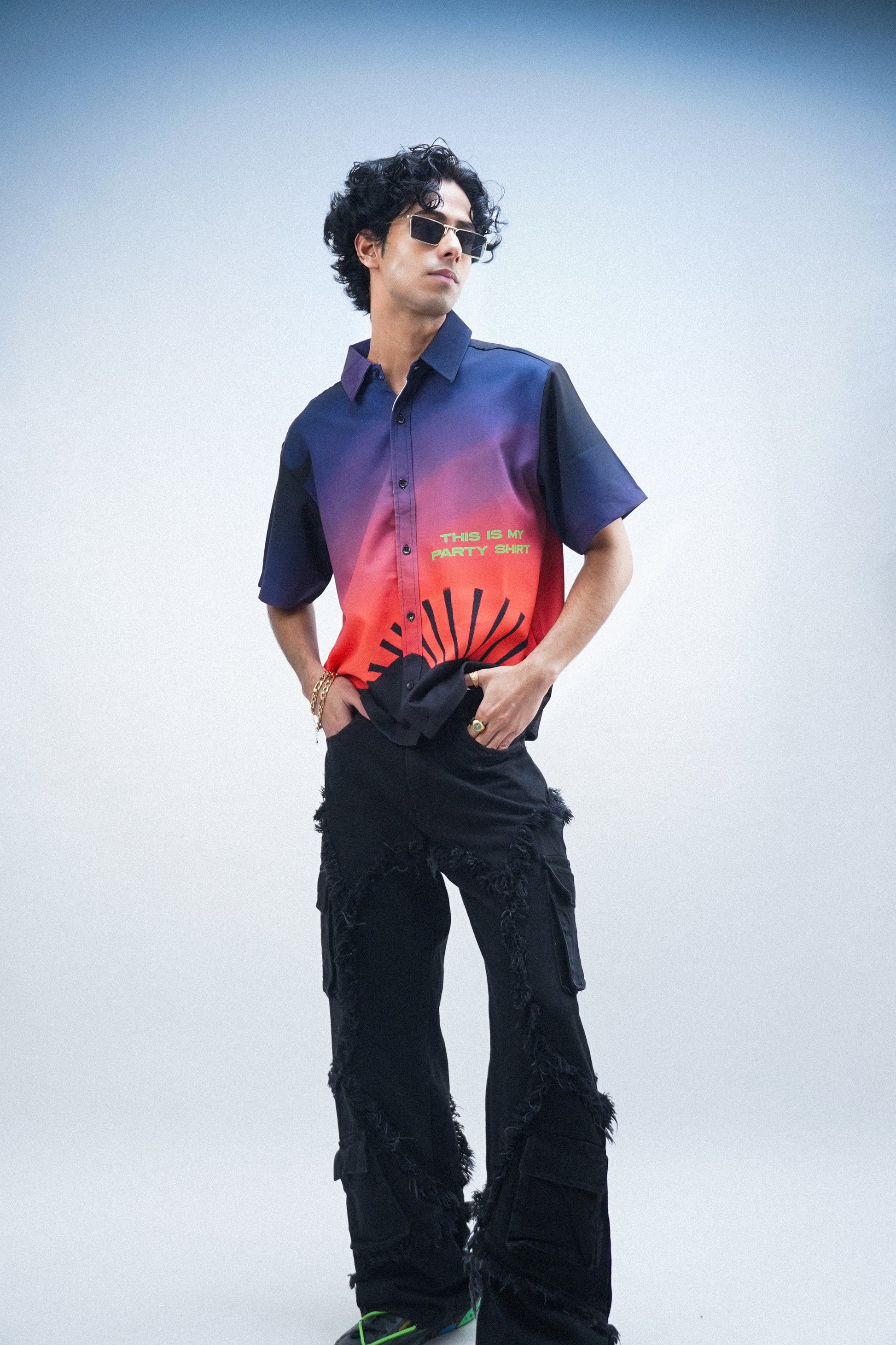 Details: Rugged texture with cargo-style pockets and raw-edge detailing