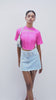 A fitted corset top in pink polyester-lycra. Boned construction with short sleeves. “Misbehaving” text printed at the chest.